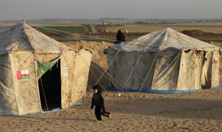 A girl runs next to tents pitched by Palestinians on the Gaza border with Israel (background), east of Jabalia, on Mar. 29, 2018, ahead of a six-week protest camp. The exceptional protest is dubbed "The Great March of Return" and has the backing of the Gaza Strip's Islamist rulers Hamas. MAHMUD HAMS / AFP