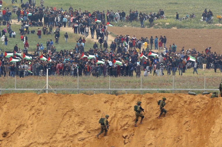 A picture taken on March 30, 2018 from the southern Israeli kibbutz of Nahal Oz across the border from the Gaza strip shows Palestinians participating in a tent city protest commemorating Land Day, with Israeli soldiers seen below in the foreground.