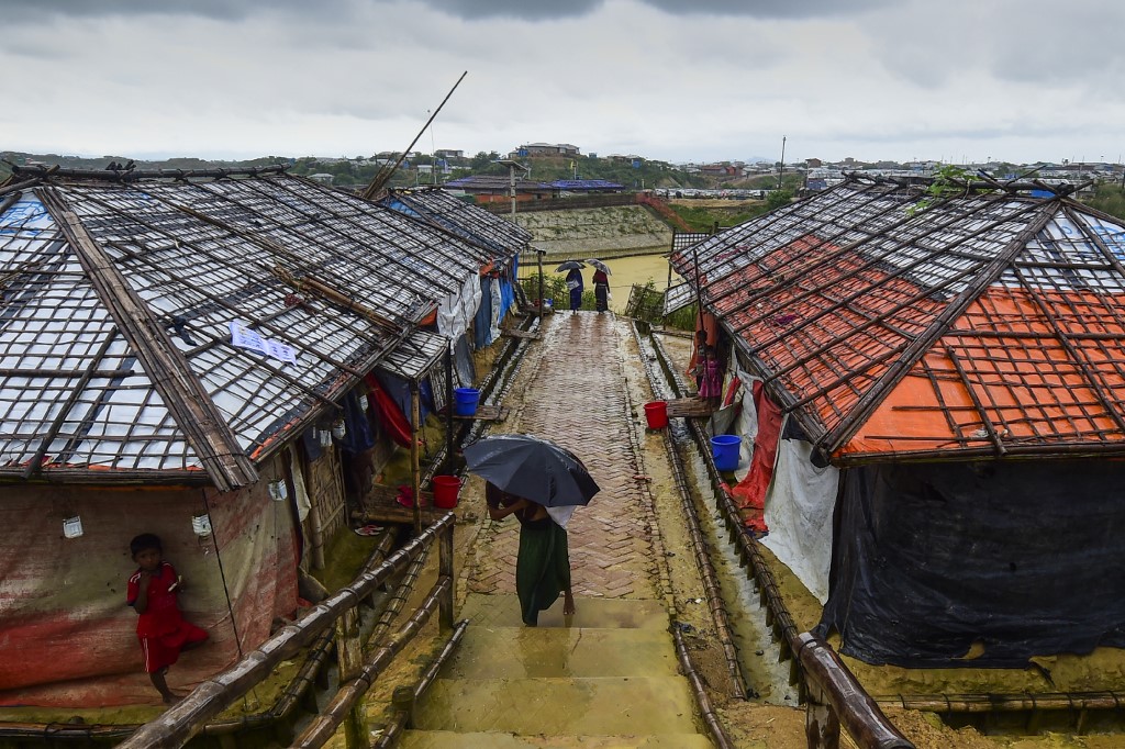 A Rohingya refugee girl shelters from the rain under an umbrella as she makes her way back home after collecting relief aid at the Kutupalong Rohingya refugee camp in Bangladesh's Ukhia district on August 24, 2019.  MUNIR UZ ZAMAN / AFP