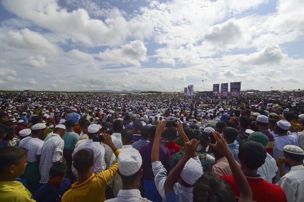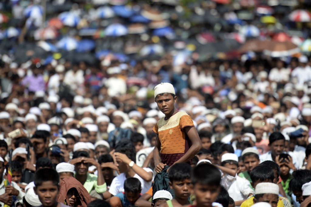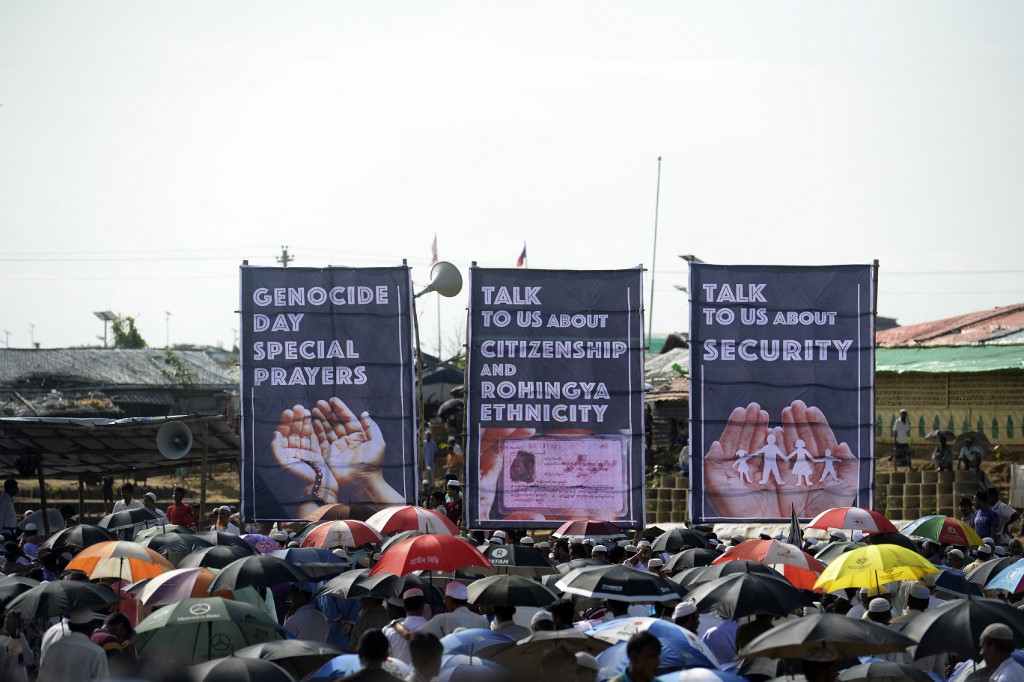 Rohingya refugees attend a ceremony organised to remember the second anniversary of a military crackdown that prompted a massive exodus of people from Myanmar to Bangladesh, at the Kutupalong refugee camp in Ukhia on August 25, 2019. MUNIR UZ ZAMAN / AFP