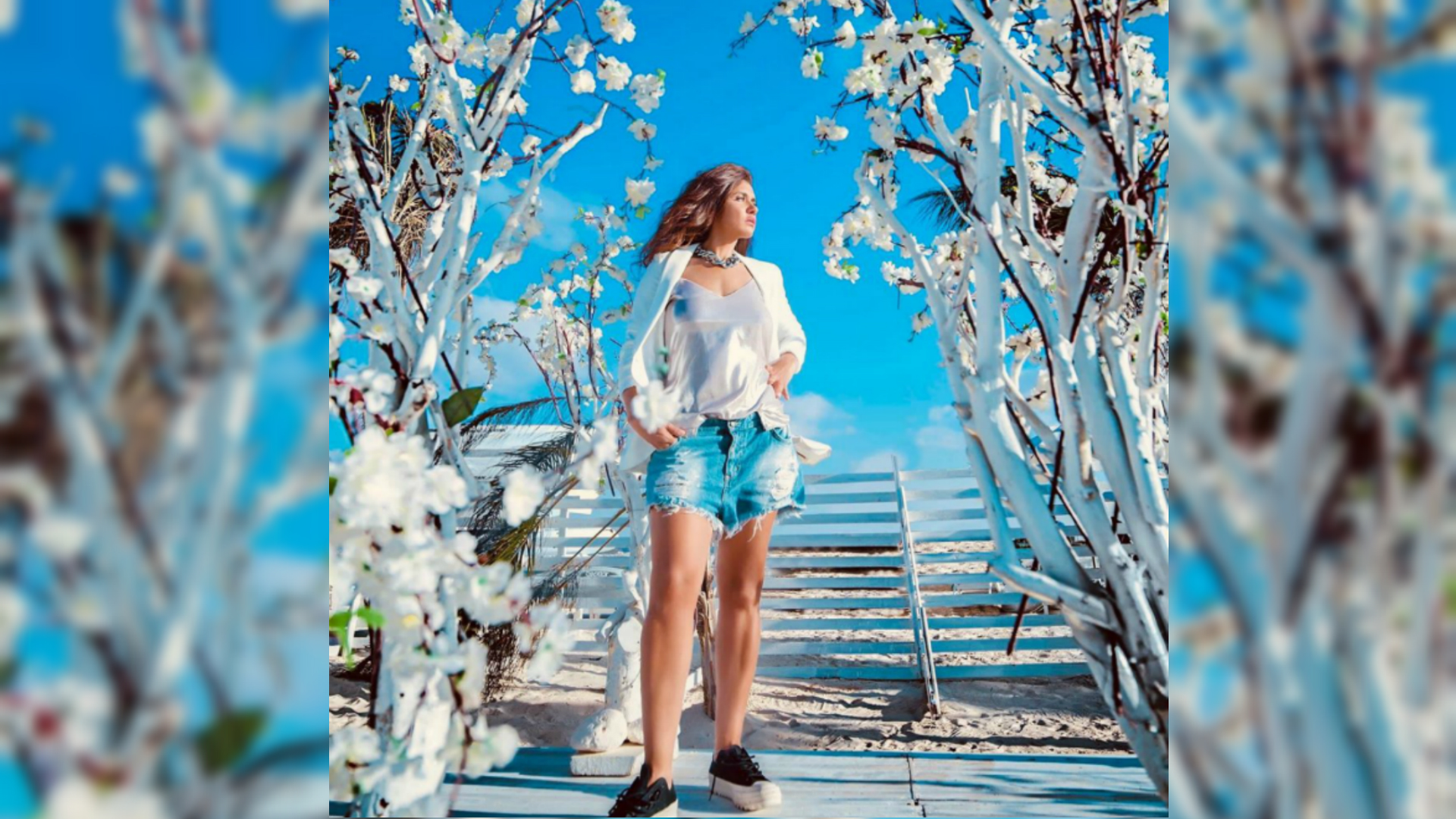 Ghada Adel had a photo session with photographer Khaled Fada for one of the magazines. The pictures were summery and were taken with the sea in the background. Ghada Adel made sure to appear with a summer look that suits the atmosphere. She wore a pair of shorts with a white blazer and a satin blouse and completed the look with a sneaker.