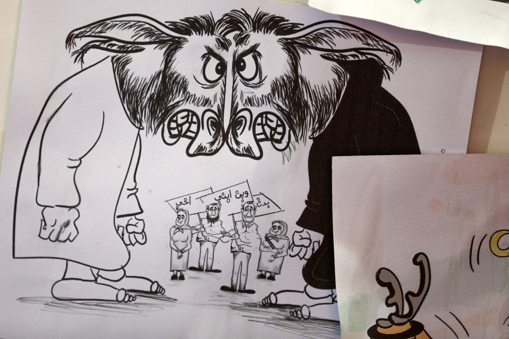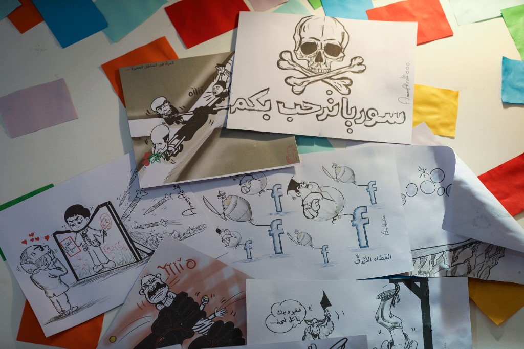 This picture taken on June 16, 2019, shows various illustrations by Syrian Cartoonist Amani al-Ali at her home studio in the city of Idlib in the eponymous northwestern province. Omar HAJ KADOUR / AFP