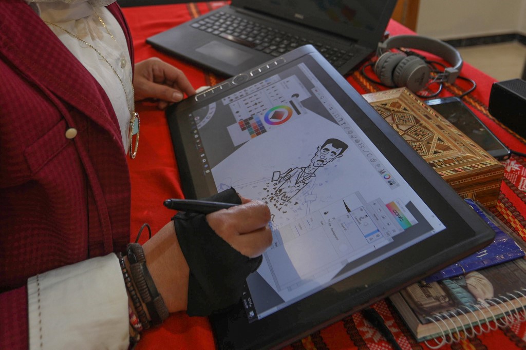 Syrian Cartoonist Amani al-Ali draws an illustration on a digital tablet device in her home studio in the city of Idlib in the eponymous northwestern province Omar HAJ KADOUR / AFP