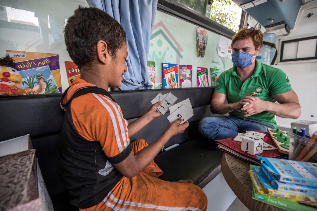 Homeless children play an educational game with a social worker inside one of the mobile units run by the Egyptian authorities and used as part of the "Atfal bala ma'wa" (Children without a home) social program, in the capital Cairo's Abbasia district on June 22, 2020. Khaled DESOUKI / AFP
