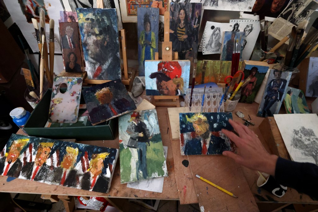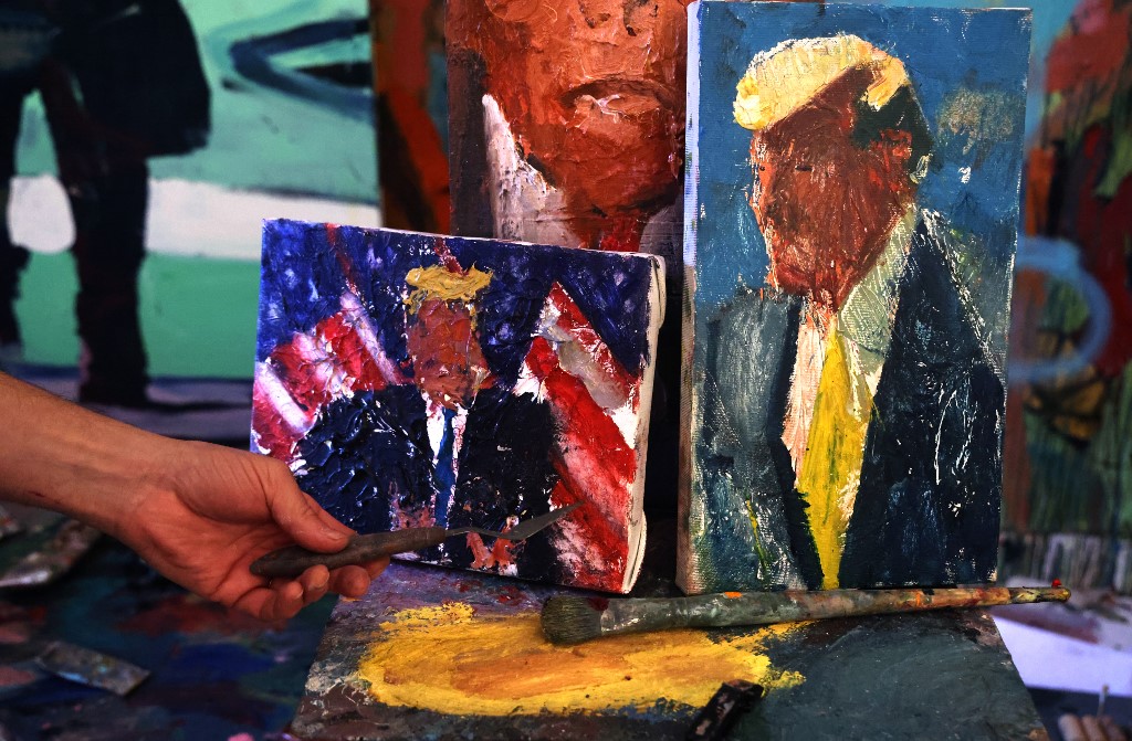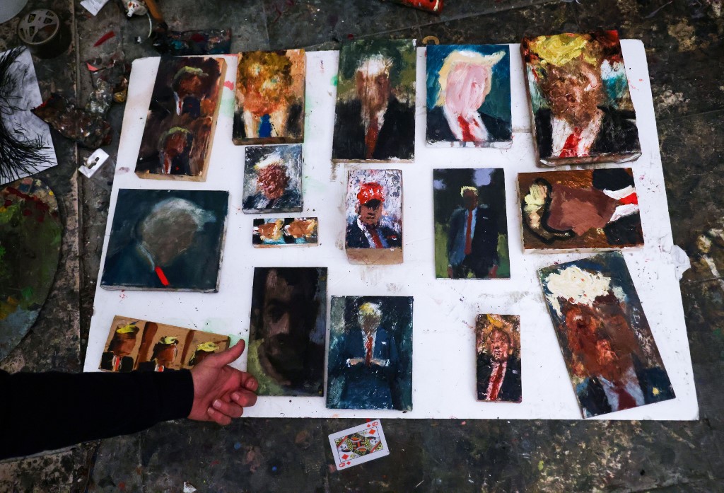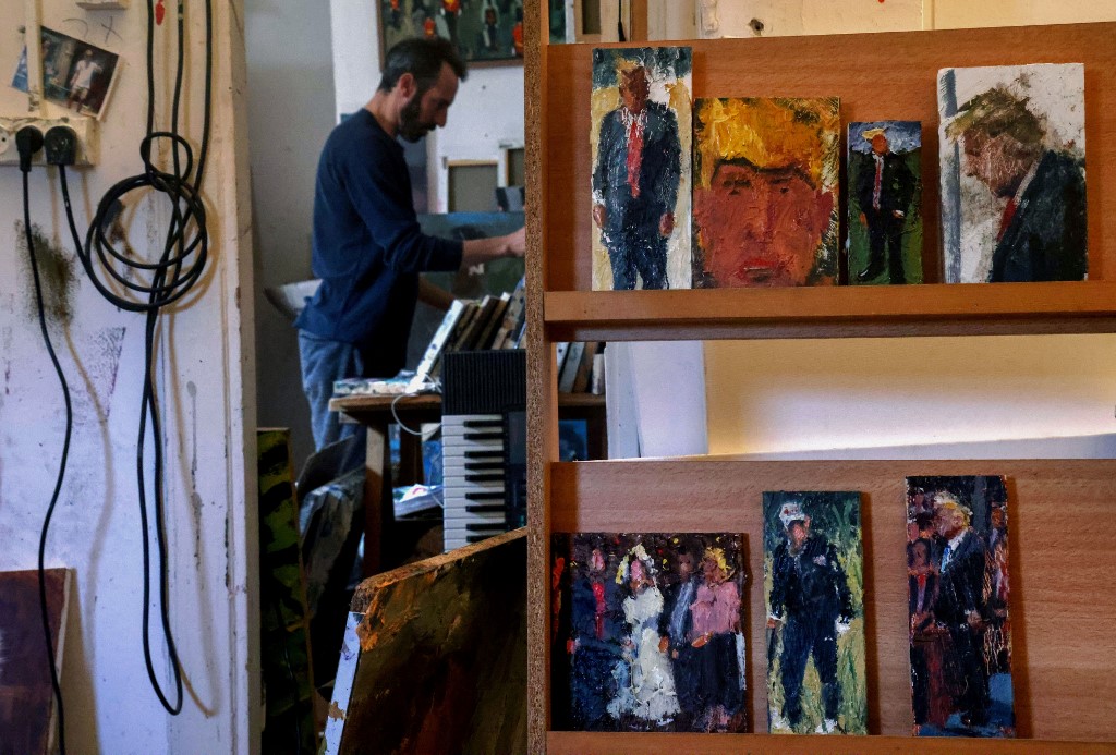 Israeli painter Iddo Markus works at his studio where he displays some of his paintings of former US president Donald Trump, in the northern port city of Haifa, on January 22, 2021. Markus became fascinated by the "tragic figure" of Donald Trump, and the walls and floor of his studio are packed with some 120 portraits of the former US presidents. Emmanuel DUNAND / AFP