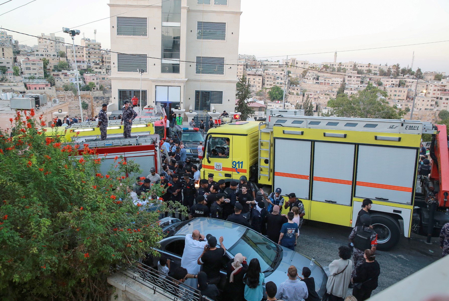 Members of the Jordanian police and ambulances deploy following the collapse of a four-storey residential building in central Amman, on September 13, 2022.(Photo by Khalil MAZRAAWI / AFP)