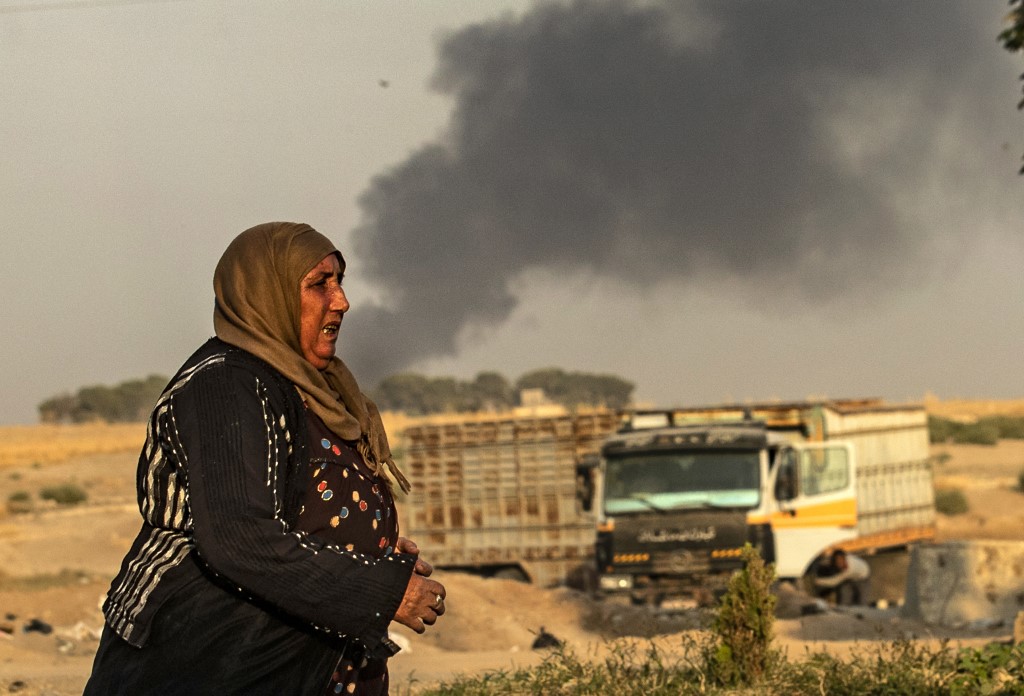 A woman walks as smoke billows following Turkish bombardment in Syria's northeastern town of Ras al-Ain in the Hasakeh province along the Turkish border on October 9, 2019. Turkey launched an assault on Kurdish forces in northern Syria with air strikes and explosions reported along the border. President Recep Tayyip Erdogan announced the start of the attack on Twitter, labelling it "Operation Peace Spring". Delil SOULEIMAN / AFP