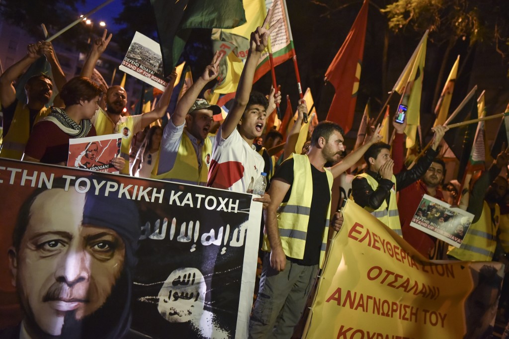 Kurds living in Athens hold banners as they protest near the Turkish embassy in Athens, on October 9, 2019. Turkey launched an assault on Kurdish forces in northern Syria with air strikes and explosions reported along the border. President Recep Tayyip Erdogan announced the start of the attack on Twitter, labelling it "Operation Peace Spring". Louisa GOULIAMAKI / AFP