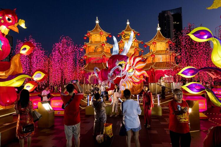 People take photos in front of a festive Chinese display outside a shopping mall in Bangkok on January 31, 2022 ahead of Lunar New Year on February 1, which marks the start of the Year of the Tiger. (Photo by Jack TAYLOR / AFP)