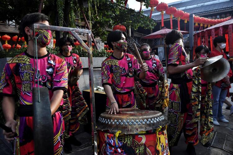 Traditional Chinese lion dancers bang drums during a performance to celebrate the upcoming Lunar New Year, at Lhong 1919 warehouse in Bangkok on January 19, 2022. (Photo by Lillian SUWANRUMPHA / AFP)