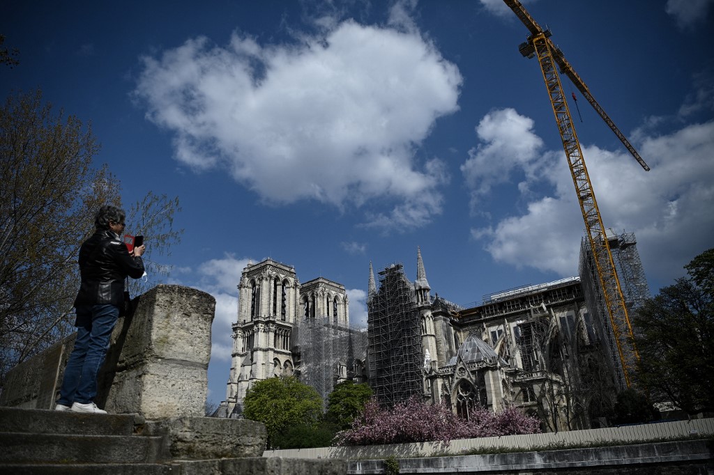 A woman takes pictures of Notre-Dame de Paris cathedral, on April 14, 2021, during the reconstruction work while April 15, 2021 will mark the two years anniversary of the fire that devastated the Cathedral, in the centre of the French capital Paris. Anne-Christine POUJOULAT / AFP