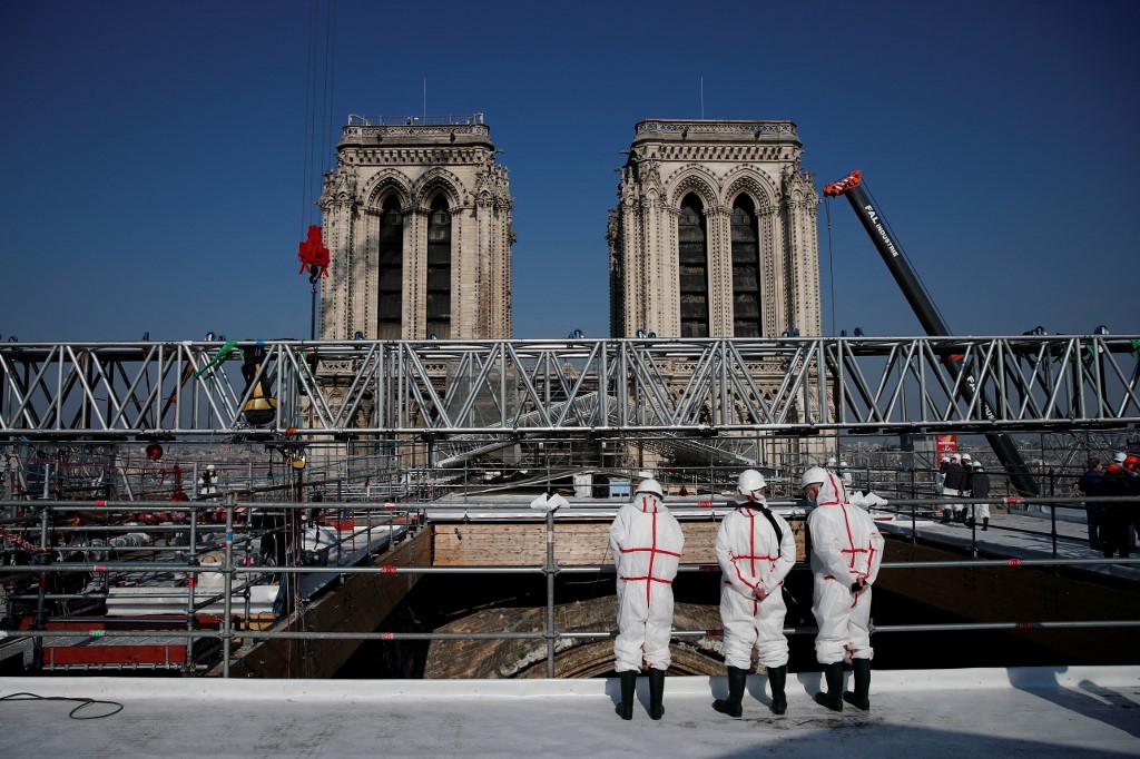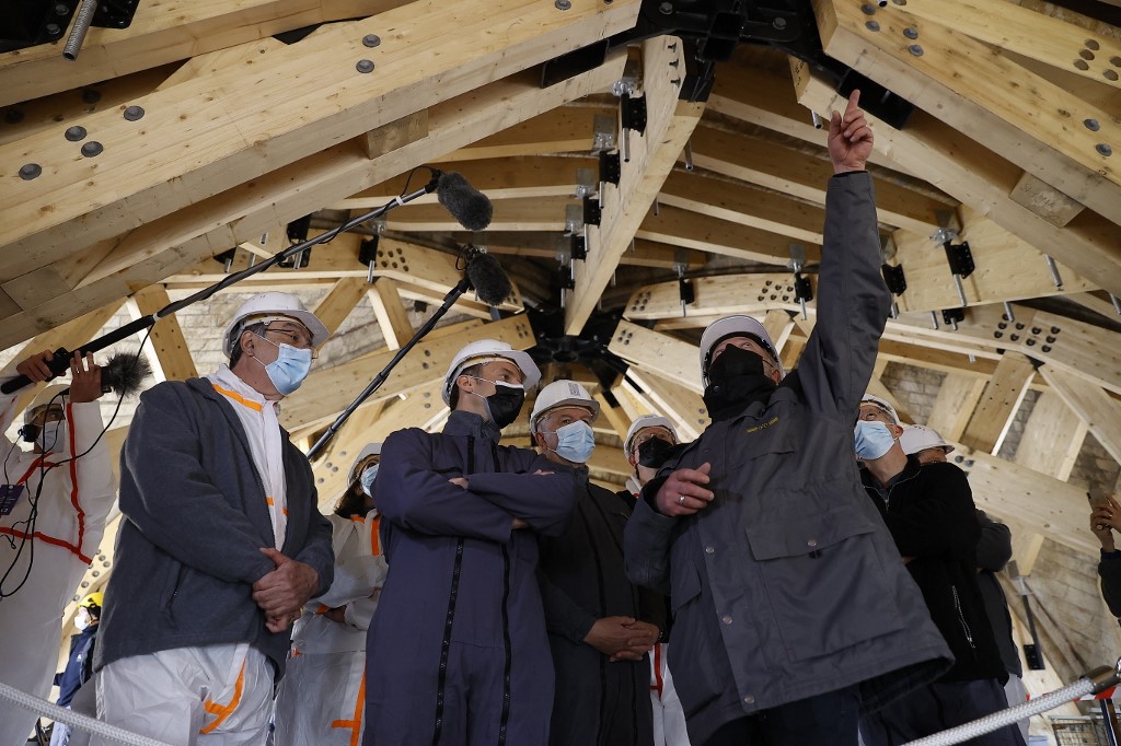 People stand on the roof of the Notre-Dame de Paris Cathedral during a visit of French President marking two years since the blaze that made the spire collapsed and destroyed much of the roof, in Paris on April 15, 2021. The actual restoration work has yet to begin as time up until now has been spent on securing the building, and the full restoration works should begin early next year. BENOIT TESSIER / POOL / AFP
