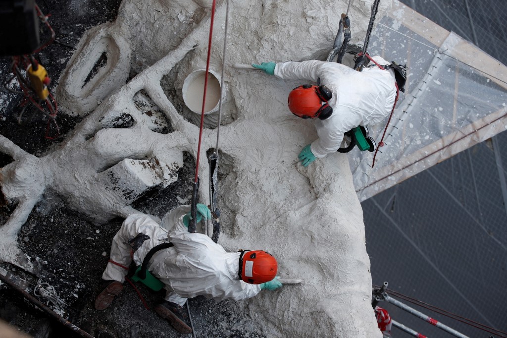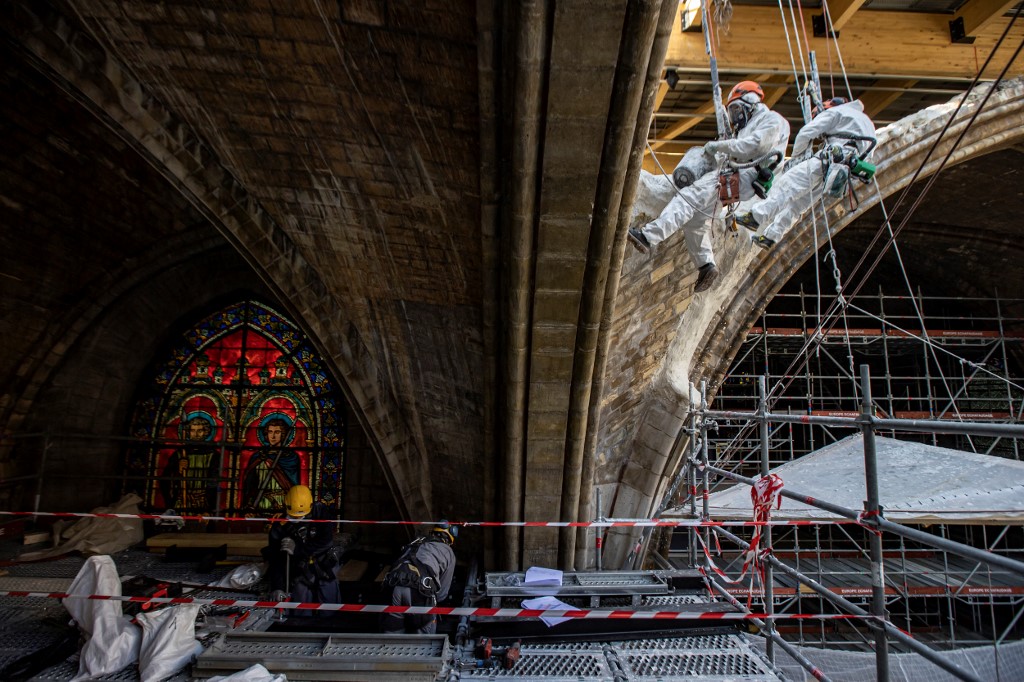Rope access technicians plaster stonework on a damaged vault of the Notre-Dame de Paris Cathedral