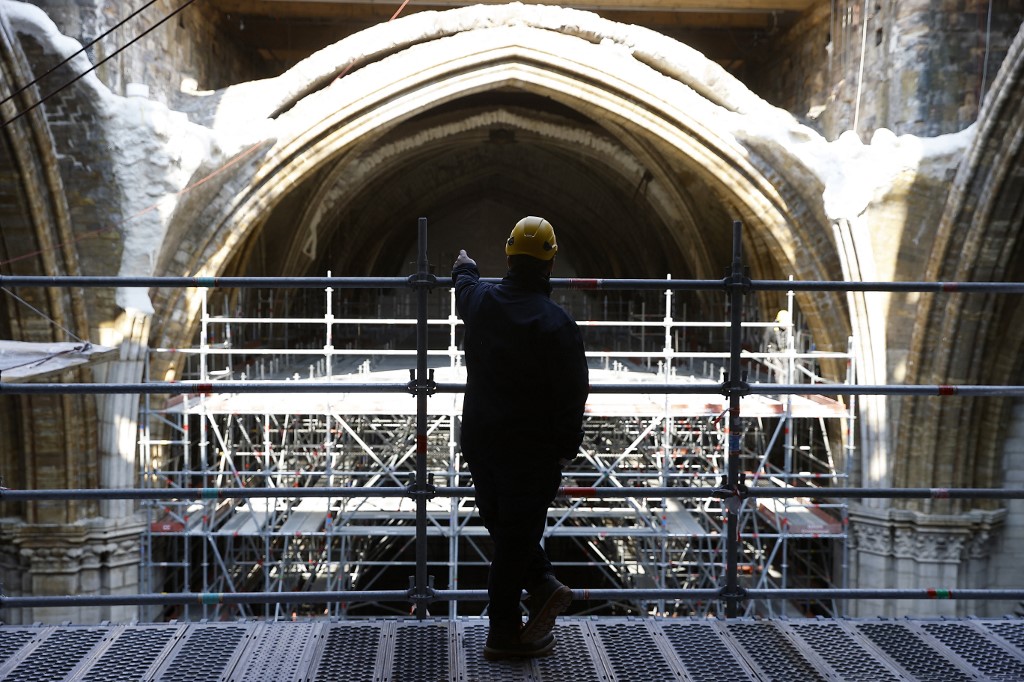 A workers looks at the vaults of the Notre-Dame de Paris Cathedral