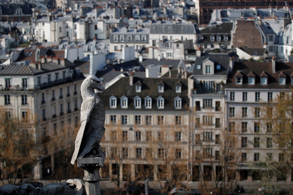 A bird statue is seen at the Notre-Dame de Paris Cathedral