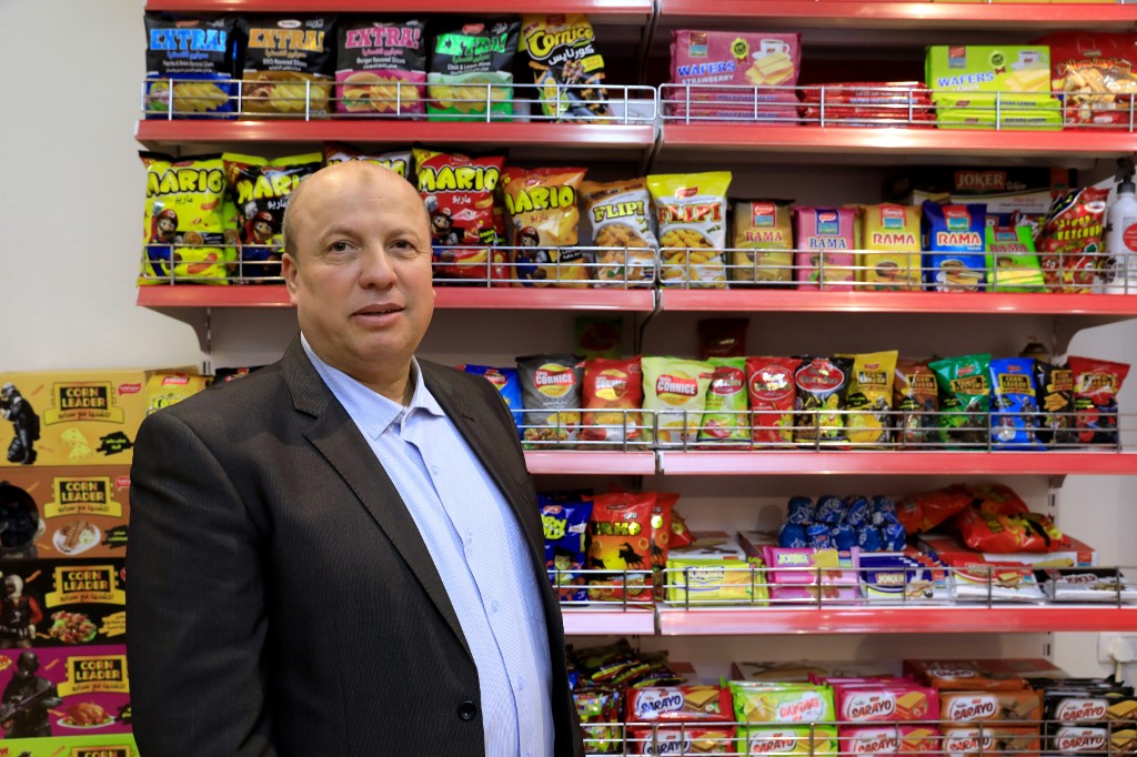 Wael al-Wadiya, chairman of Sarayo Alwadiya company, poses for a photo in front of some of the products his factory produces in Gaza City on February 4, 2020. Israel permits some vegetables and clothing to be sold abroad but not processed food.  EMMANUEL DUNAND / AFP
