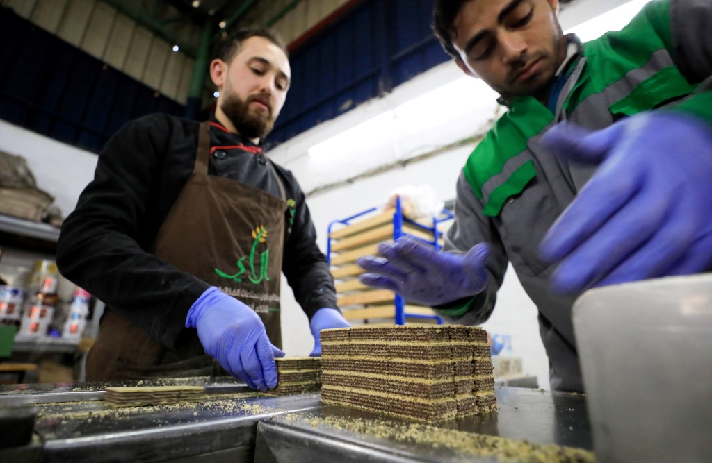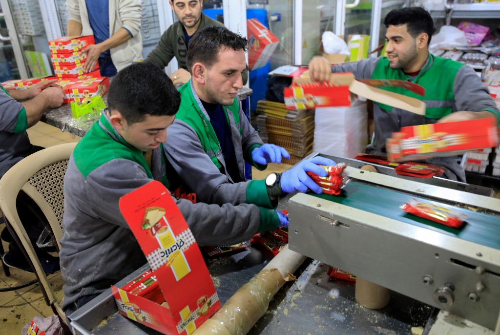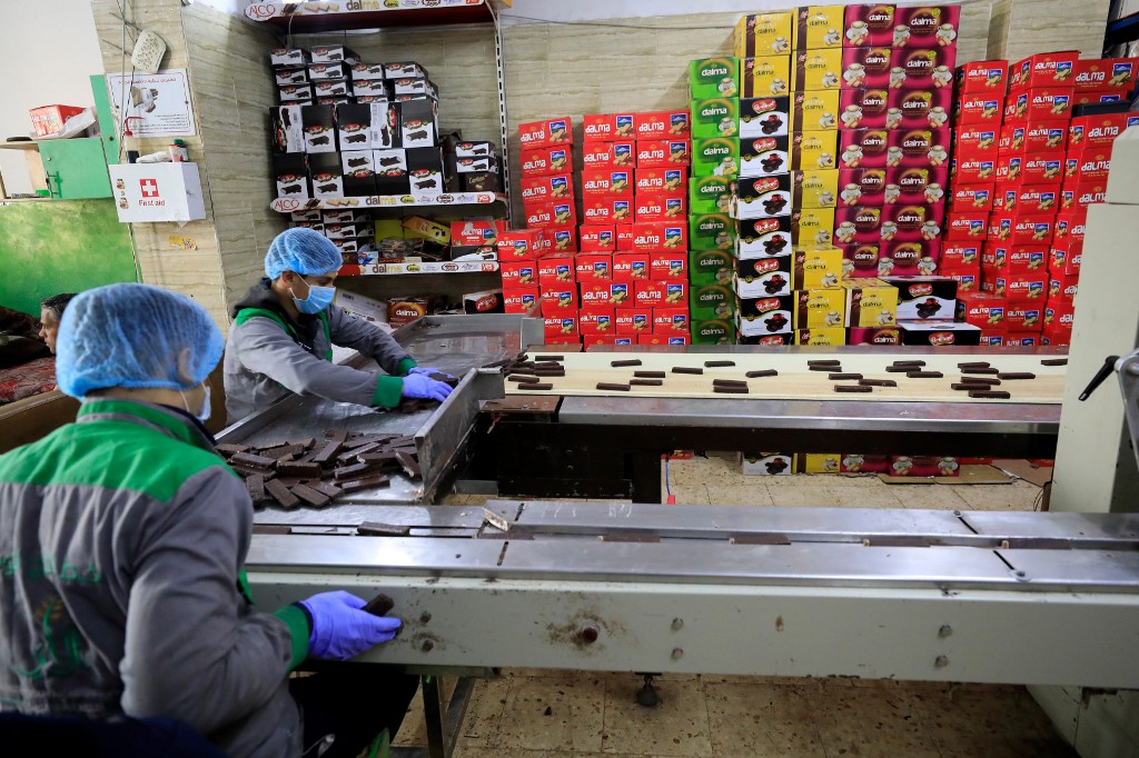 Workers at the al-Arees sweets factory sort a batch of chocolate-covered biscuits in Gaza City on February 5, 2020. Al-Arees's products are Gazan but their components are not, as few of the basic raw ingredients are produced in the impoverished Mediterranean coastal strip. Emmanuel DUNAND / AFP