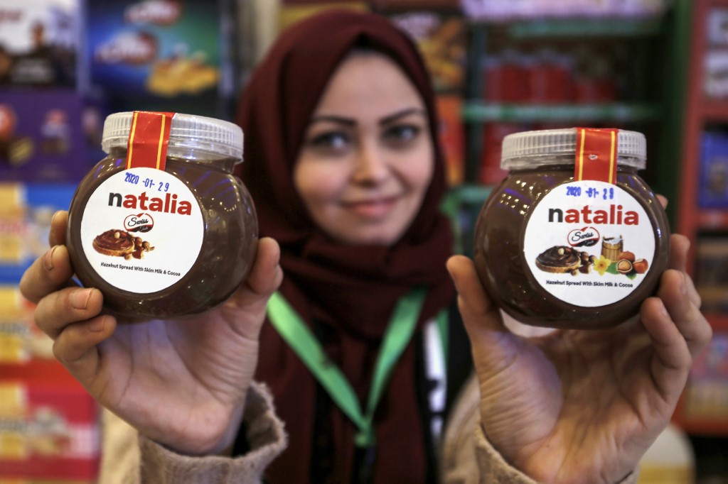 A shop employee holds up jars of a Gazan version of a world famous spread, dubbed 'Natalia', in Gaza city on February 12, 2020. Al-Arees's products are Gazan but their components are not, as few of the basic raw ingredients are produced in the impoverished Mediterranean coastal strip. MOHAMMED ABED / AFP