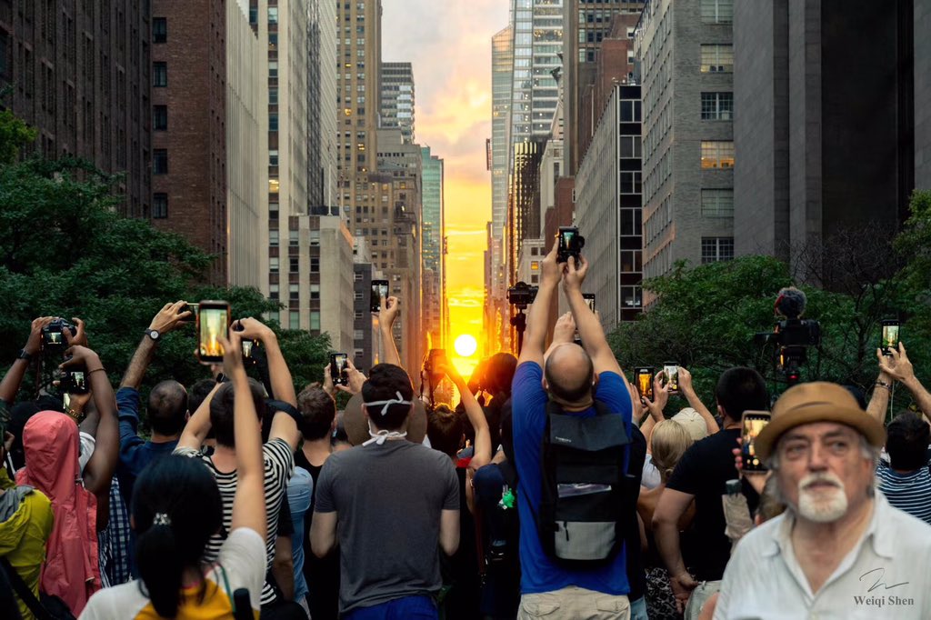 Manhattanhenge is an astronomical event that occurs every year before and after the summer solstice. The annual event is a series of four evenings where the sun perfectly aligns with New York City's street grid, and New Yorkers congregate in intersections to capture it.