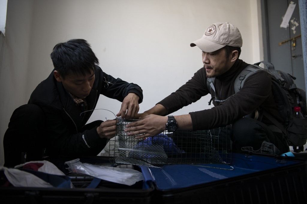 This photo taken on October 23, 2019 shows pet detective Sun Jinrong (R) and his assistant preparing a trap as they search for a missing cat in a residential compound in Beijing. Private sleuth Sun Jinrong brings heat detectors, tiny surveillance cameras, and a blowdart loaded with a tranquiliser to his search for one desperate client's missing loved one: A cat named Duoduo. NOEL CELIS / AFP