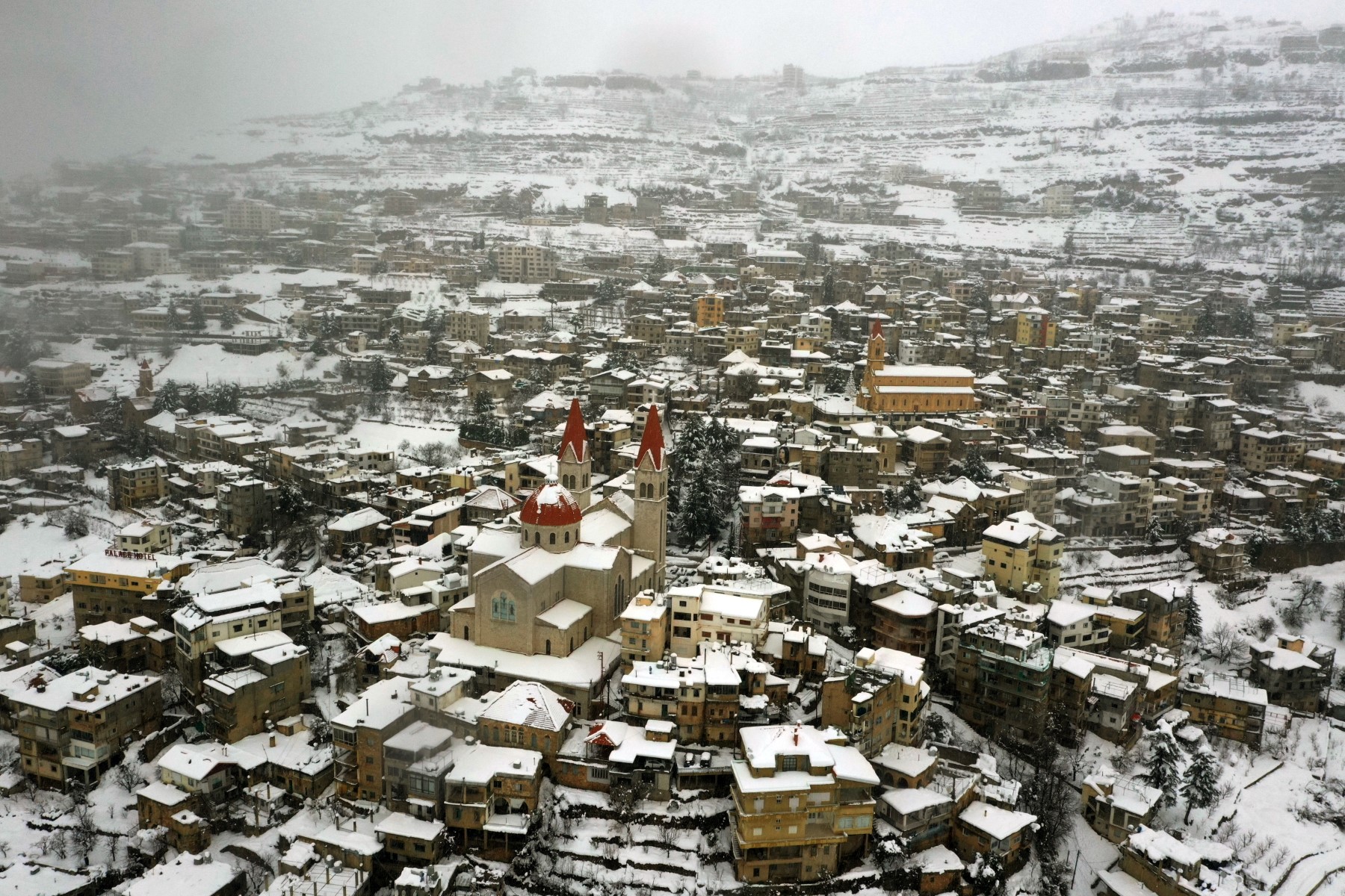 This areal view shows the snow-coverd town of Bcharr in mount Lebanon, north of the capital Beirut, in 2021. / AFP / JOSEPH EID