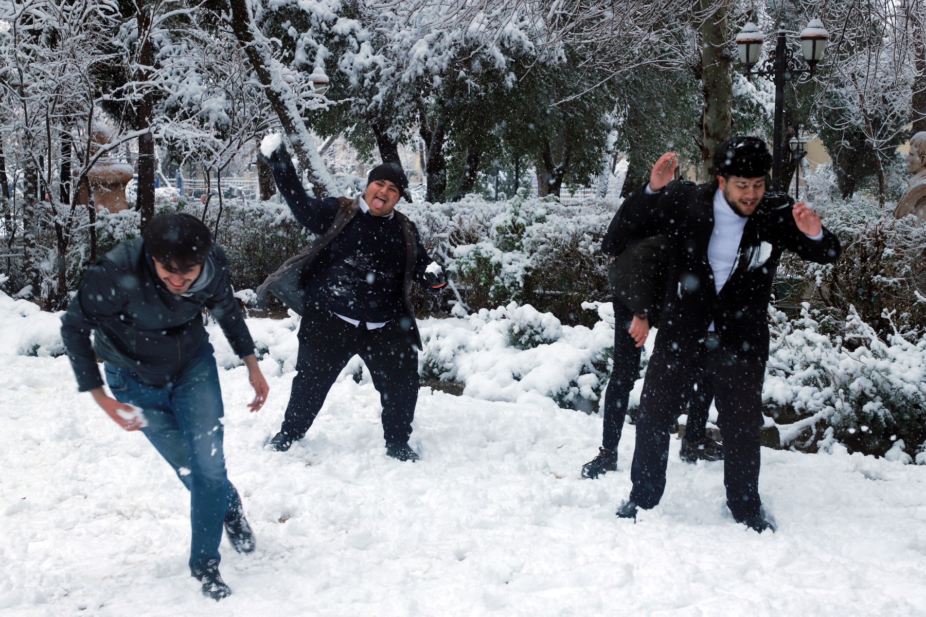 Iraqi Kurds play in a snow covered park in the northern city of Sulaimaniyah in Iraq's autonomous Kurdish region, 270 kms (170 miles) north of Baghdad, on January 17, 2022 following the first snow storm this year. (Photo by Shwan MOHAMMED / AFP)