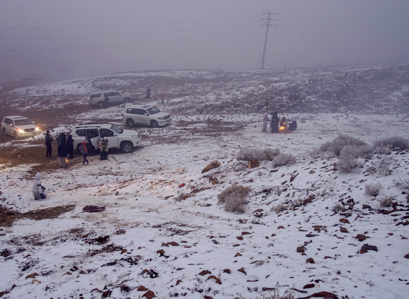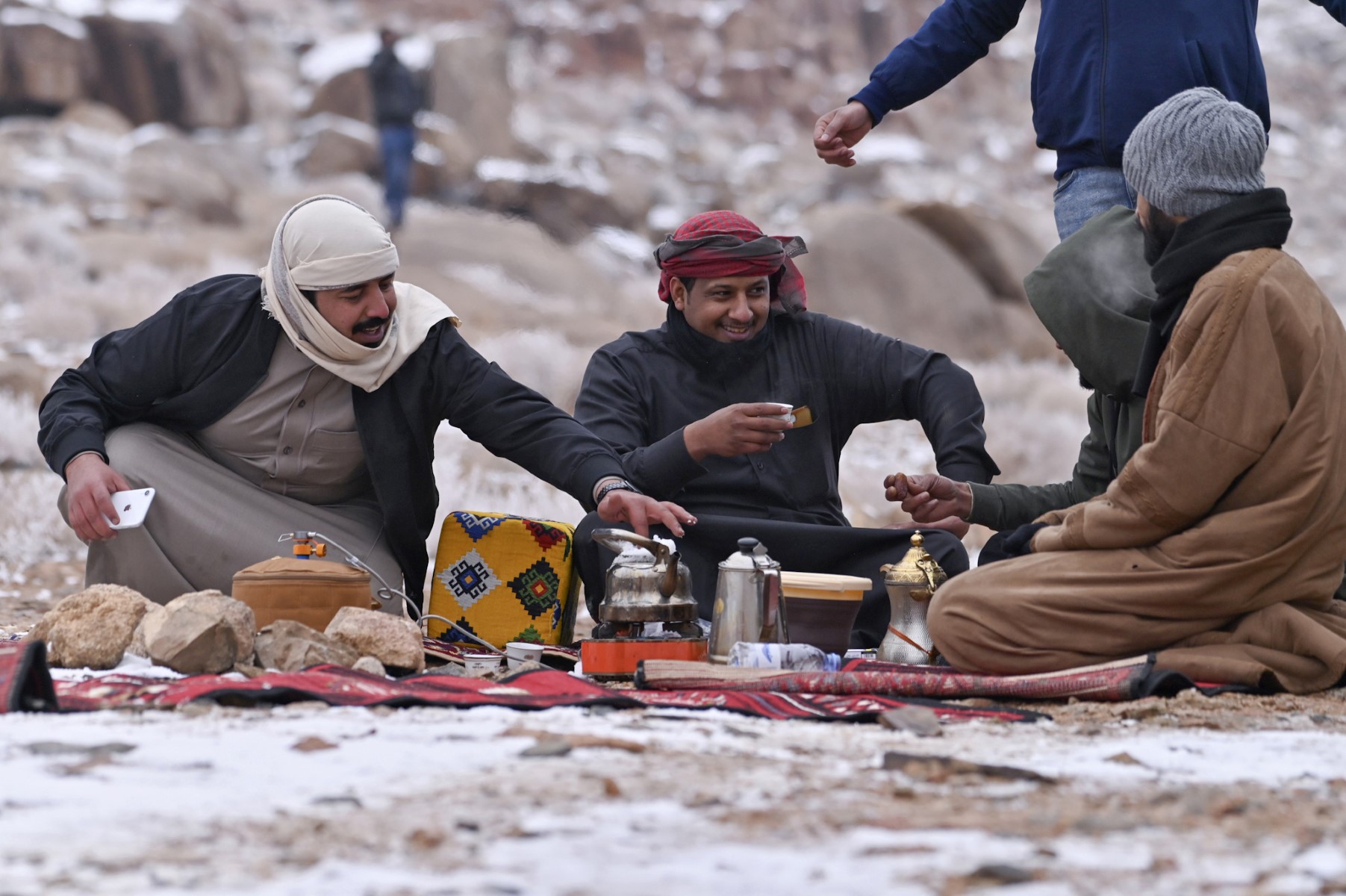 Saudis melt snow for coffee in Jabal al-Lawz (Mountain of Almonds), west of the Saudi city of Tabuk on January 17, 2022. (Photo by Ibrahim ASSIRI / AFP)