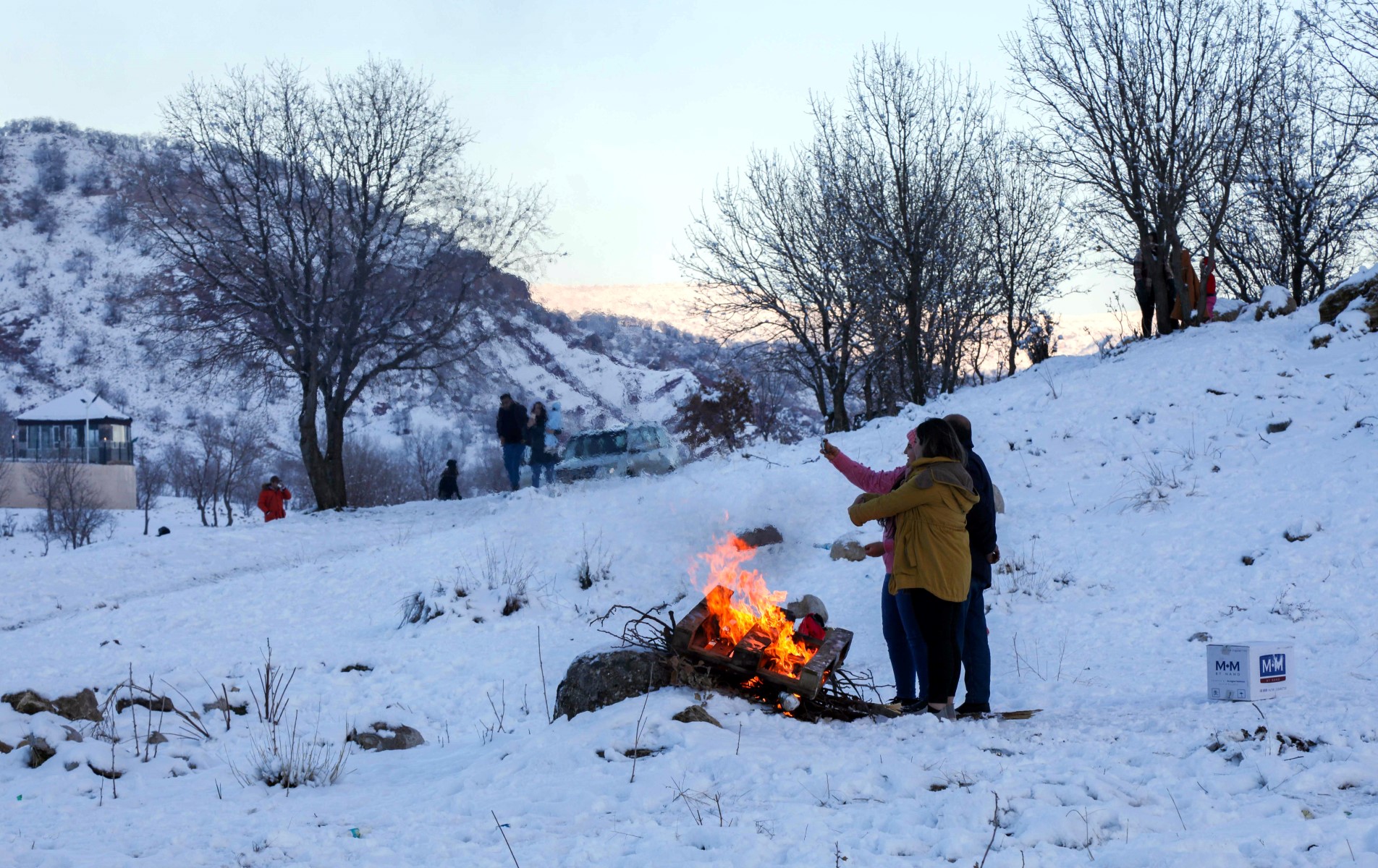Iraqis light a fire at the snow covered Safin Mountain on January 18, 2022 near the city of Arbil, the capital of Iraq's northern Kurdish autonomous region. (Photo by SAFIN HAMED / AFP)