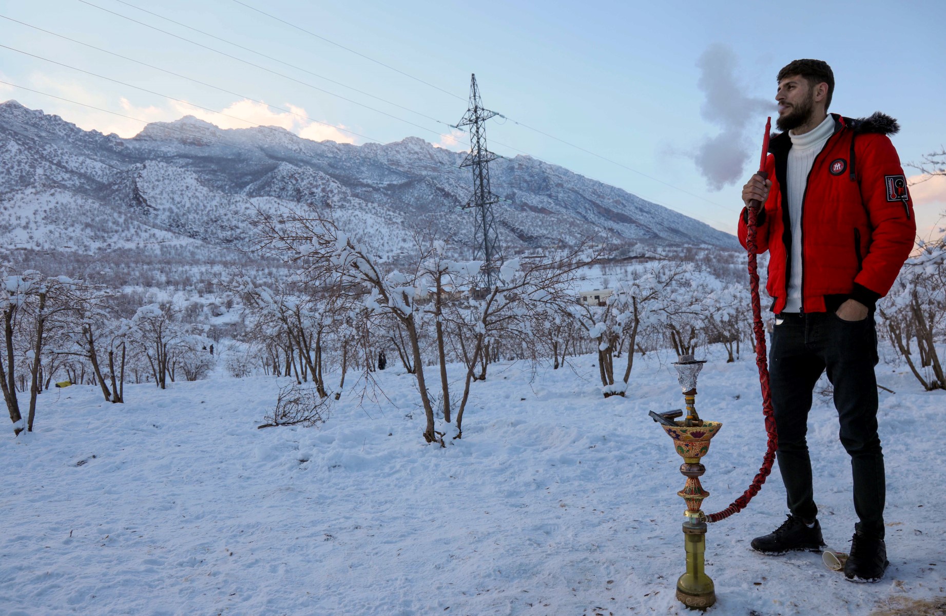 An Iraqi man smokes a waterpipe, locally known as narguileh, at the snow covered Safin Mountain on January 18, 2022 near the city of Arbil, the capital of Iraq's northern Kurdish autonomous region. (Photo by SAFIN HAMED / AFP)