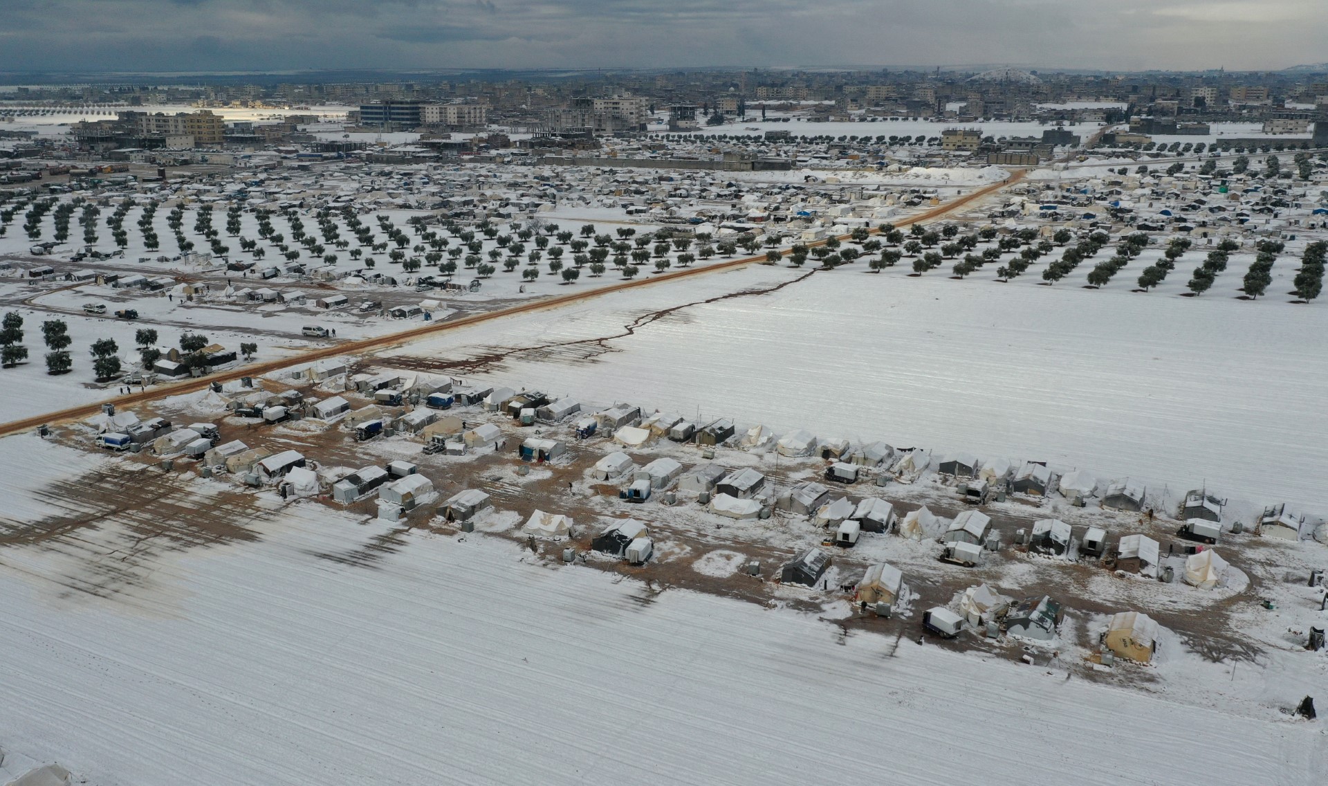 Graphic content / An aerial picture shows a camp for internally displaced people covered in snow in Syria's town of Azaz in the rebel-controlled northern countryside of Syria's Aleppo province near the border with Turkey, on January 19, 2022. (Photo by Aref TAMMAWI / AFP) syria - conflict - weather - snow syria - conflict - weather - snow