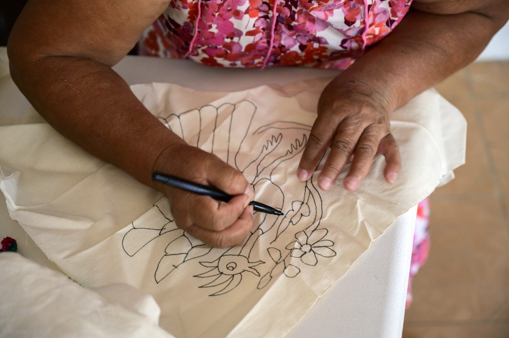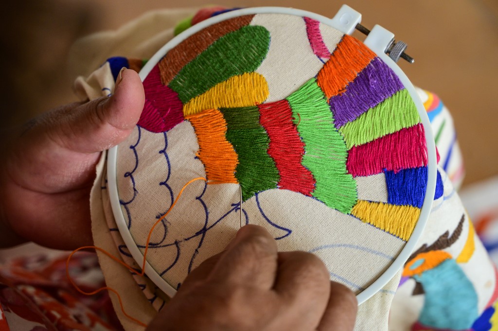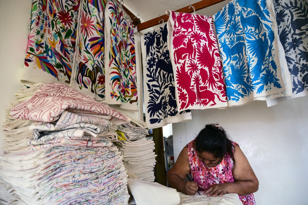 Mexican artisan Glafira Candelaria Jose, of the Otomi ethnic group, embroiders one of her designs at her workshop in San Nicolas village, in Tenango de Doria, Hidalgo state, Mexico. Pedro PARDO / AFP