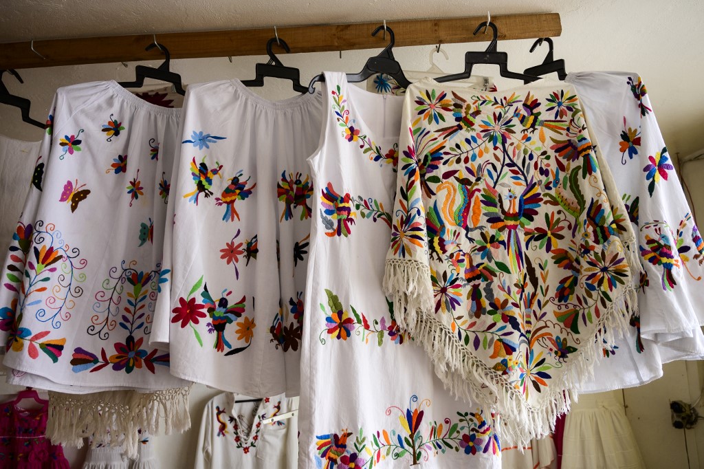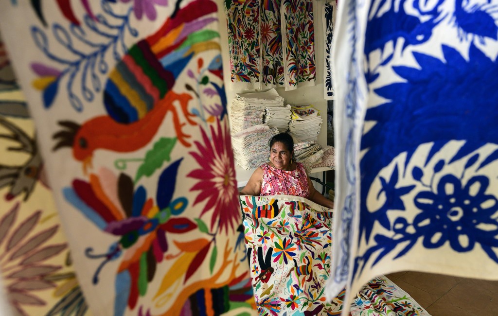 Mexican artisan Glafira Candelaria Jose, of the Otomi ethnic group, shows one of her designs at her workshop in San Nicolas village, in Tenango de Doria, Hidalgo state, Mexico. Pedro PARDO / AFP