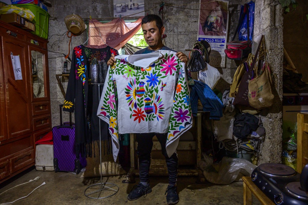 Mexican artisan of the Otomi ethnic group Oliver Teodoro Lopez, shows one of his designs at his workshop in San Nicolas Village, in Tenango de Doria, Hidalgo state, Mexico. Pedro PARDO / AFP