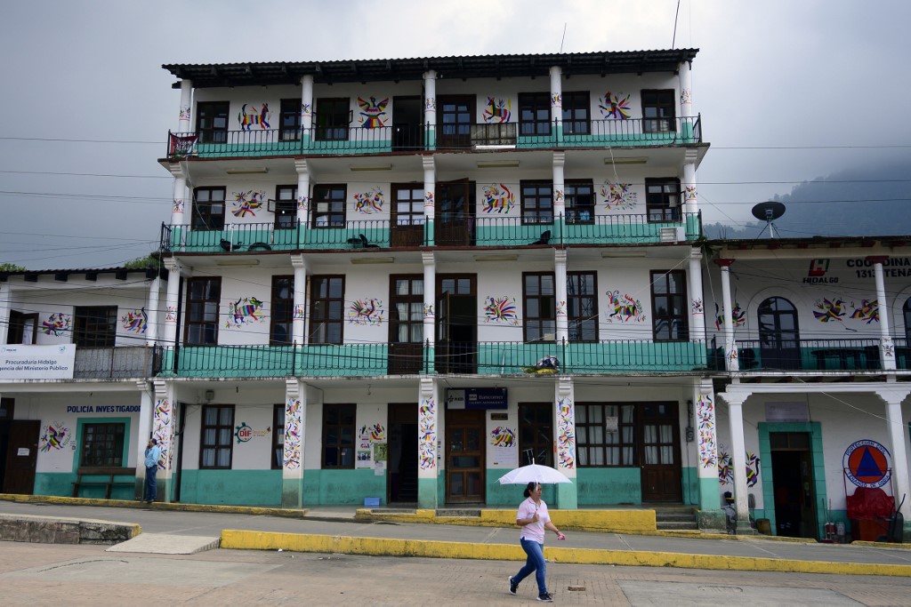 View of the facade of a bullding in Tenango de Doria decorated with designs by San Nicolas artisans, in Tenango de Doria, Hidalgo state, Mexico. Pedro PARDO / AFP