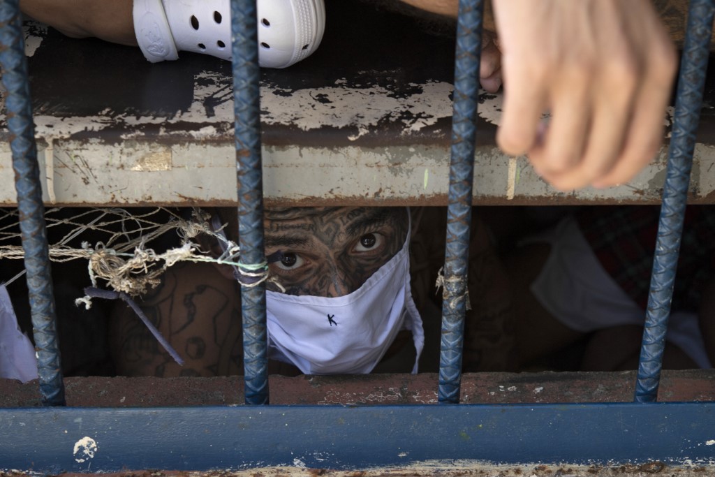 A member of the 18 gang looks on from an overcrowded cell at the Quezaltepeque prison, in Quezaltepeque, El Salvador, on September 4, 2020. Authorities from the General Directorate of Penal Centres (DGCP) visited three Salvadorean prisons, some of maximum security, to check the situation of inmates and carry out searches amid the COVID-19 novel coronavirus pandemic. Yuri CORTEZ / AFP