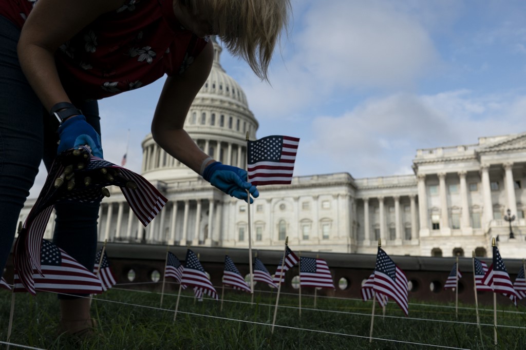 People place US flags in the ground to honor the victims of the 9/11 terrorist attack outside the US Capitol Building on September 11, 2020 in Washington, D.C. Alex Edelman / AFP