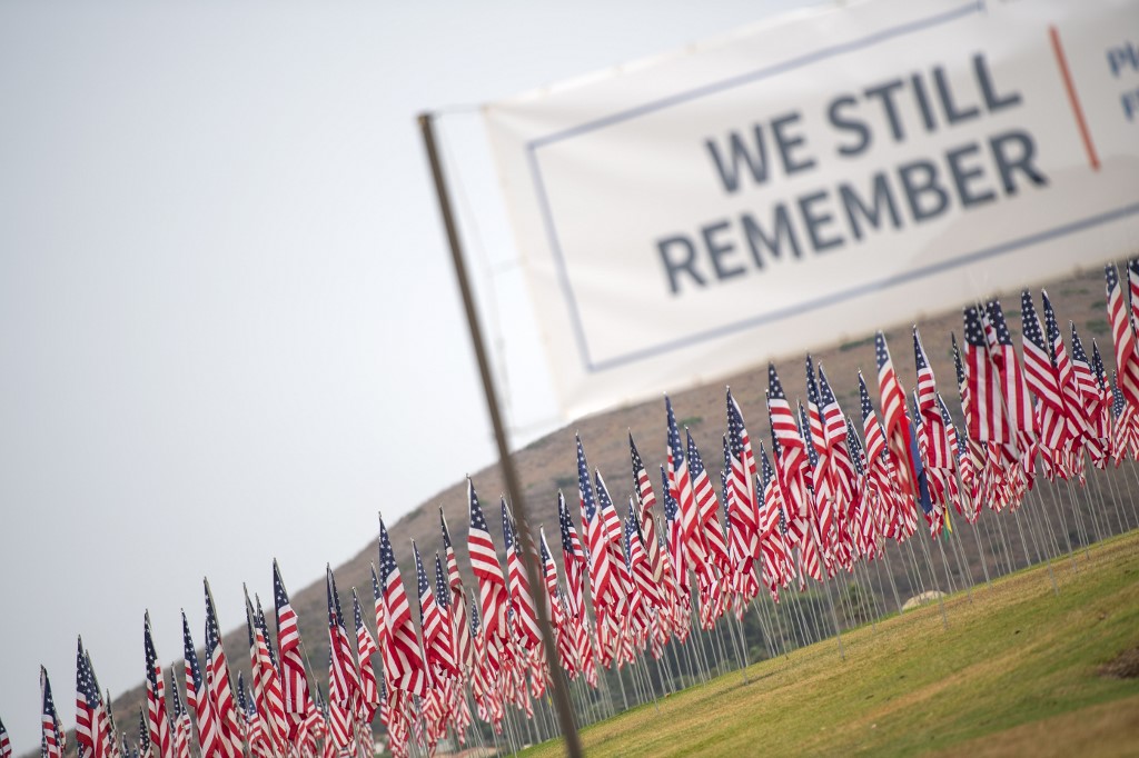 Some 3,000 flags comprise a 9/11 memorial at Pepperdine University in Malibu, California, on September 11, 2020, as the US commemorates the 19th anniversary of the attacks. Each flag represents a victim and their nationality. VALERIE MACON / AFP