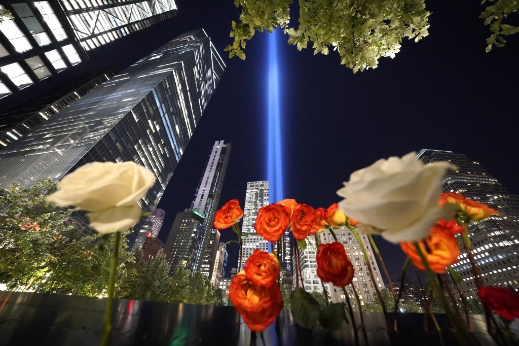 Roses are seen on the 9/11 Memorial as the Tribute in Light art installation shines into the sky over Manhattan on September 11, 2020 in New York to mark the 19th anniversary of the 9/11 attacks. TIMOTHY A. CLARY / AFP