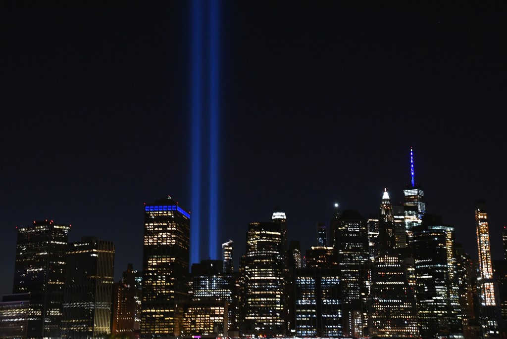 The Tribute in Light art installation shines into the sky over Manhattan on September 11, 2020 in New York to mark the 19th anniversary of the 9/11 attacks. Angela Weiss / AFP