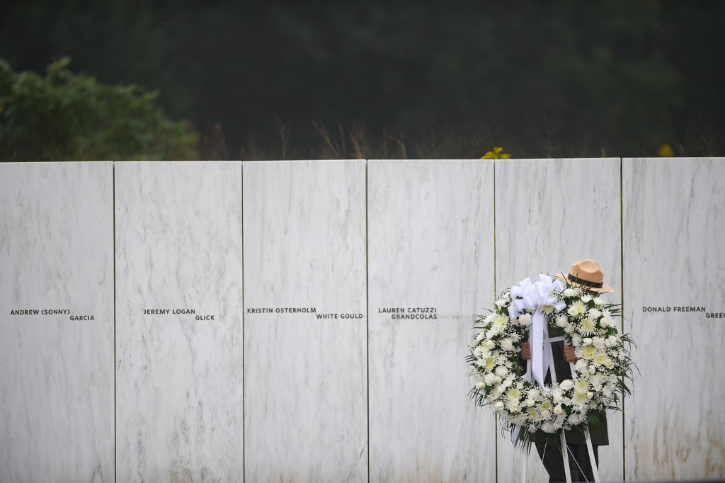 A US Park Ranger moves a memorial wreath prior to President Donald J. Trump delivering remarks at the Flight 93 National Memorial commemorating the 17th Anniversary of the crash of Flight 93 and the September 11th terrorist attacks on September 11, 2020 in Shanksville, Pennsylvania. The nation is marking the nineteenth anniversary of the terror attacks of September 11, 2001, when the terrorist group al-Qaeda flew hijacked airplanes into the World Trade Center and the Pentagon, killing nearly 3,000 people. Jeff Swensen/Getty Images/AFP JEFF SWENSEN / GETTY IMAGES NORTH AMERICA / Getty Images via AFP