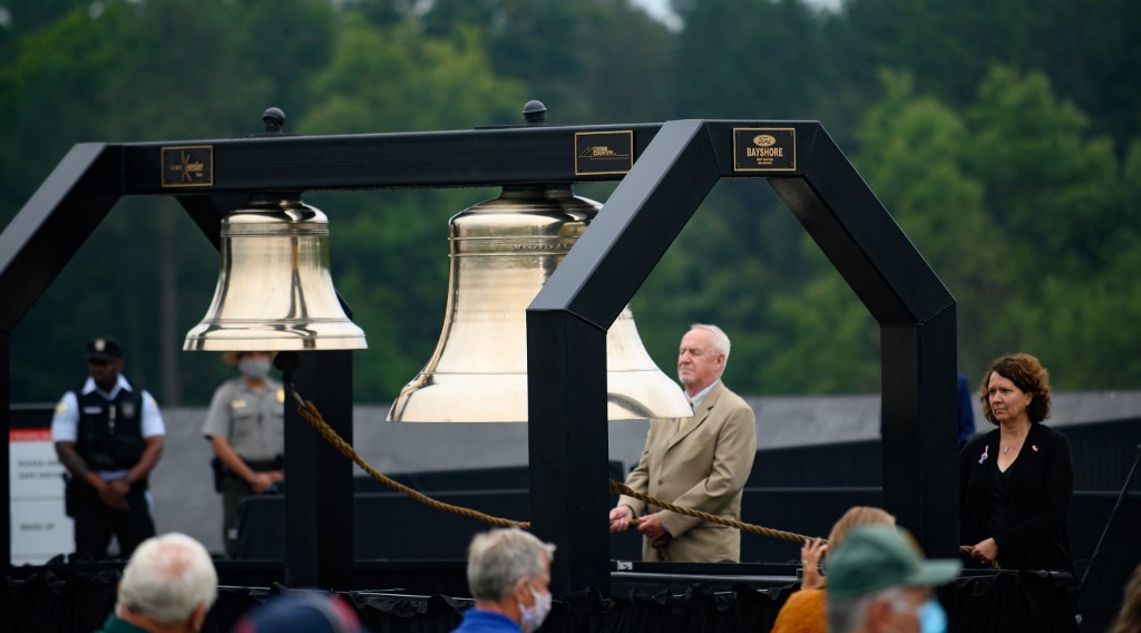 The ringing of bells as names are called during a ceremony at the Flight 93 National Memorial commemorating the 19th anniversary of the crash of Flight 93 and the September 11th terrorist attacks on September 11, 2020 in Shanksville, Pennsylvania. The nation is marking the nineteenth anniversary of the terror attacks of September 11, 2001, when the terrorist group al-Qaeda flew hijacked airplanes into the World Trade Center and the Pentagon, killing nearly 3,000 people. Jeff Swensen/Getty Images/AFP JEFF SWENSEN / GETTY IMAGES NORTH AMERICA / Getty Images via AFP