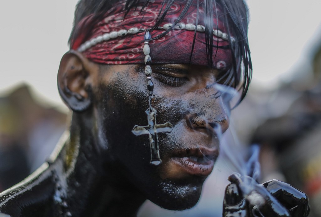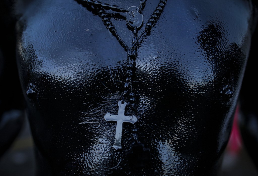 A catholic faithful smeared in burnt oil, takes part in the opening of the ten-day celebration of the Santo Domingo de Guzman festival in Managua, on August 1, 2019. INTI OCON / AFP