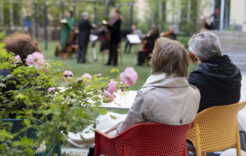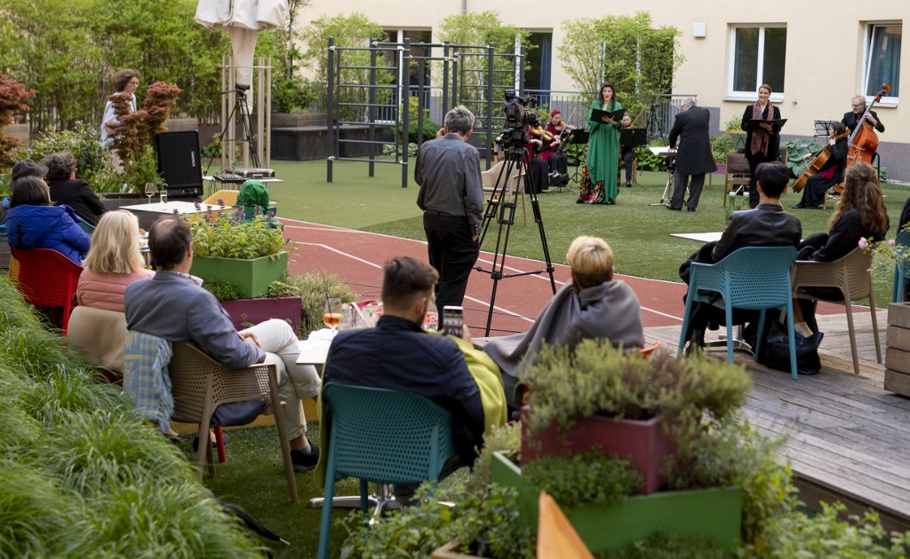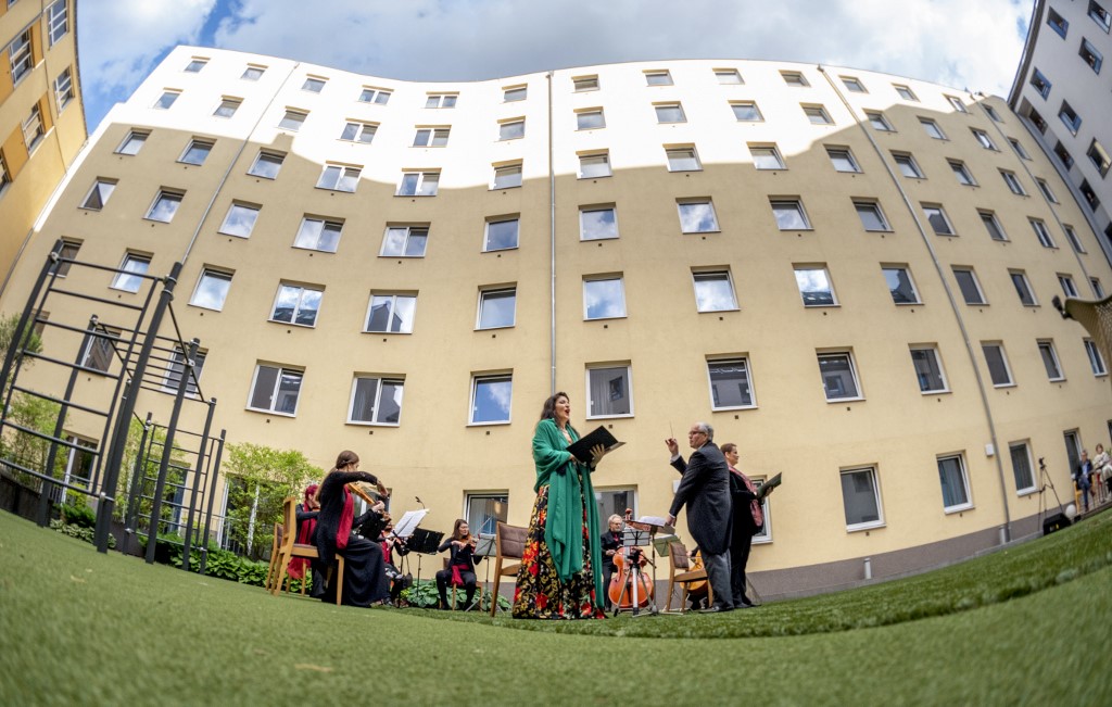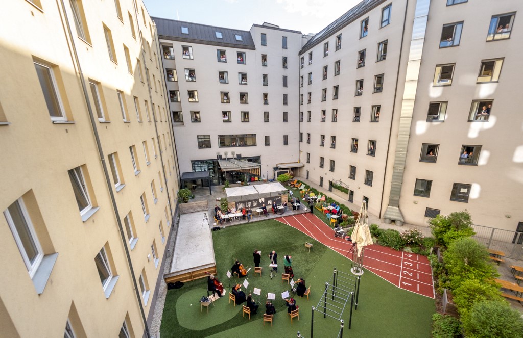 The guest bedrooms, which have stood empty during the coronavirus lockdown, were transformed into opera boxes for an evening, and the hotel courtyard into a stage to create a rare moment of joy in the city of music on Saturday.