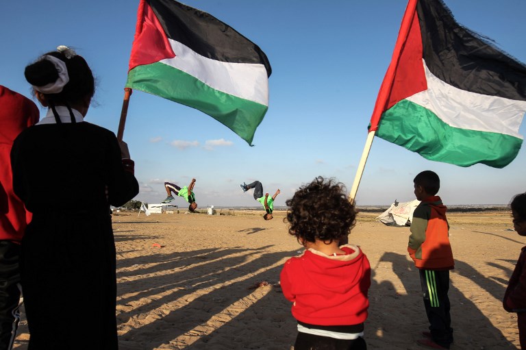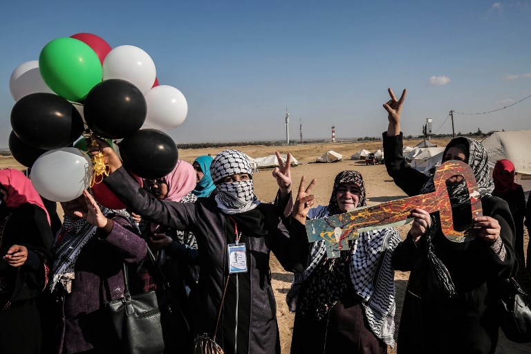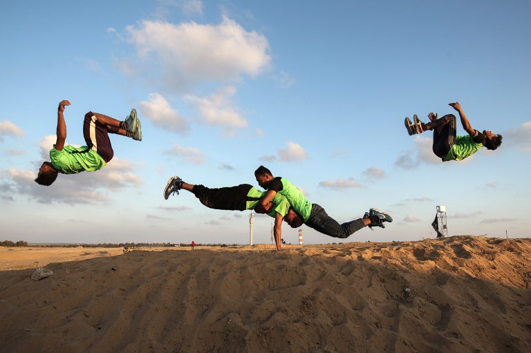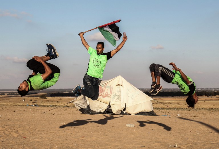 The following pictures show a different more jovial, happy sight of Palestinians, as a fun people, who love life, are sports-conscious, and have deep aspirations. Their presence here are at the sight of pitched up tents in southern Gaza, near the border with Israel, to demonstrate the right of Palestinian refugees to return to the villages and towns they were expelled from when Israel was established in 1948. The tents are part of a six-week campaign ending on 15 May, protesting the 70th anniversary of its creation.