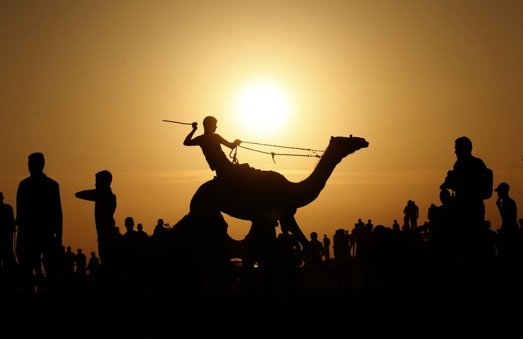 A Palestinian jockey is silhouetted as he competes in a local camel race held at the destroyed Gaza airport, in Rafah in the southern Gaza Strip on October 20, 2019. SAID KHATIB / AFP