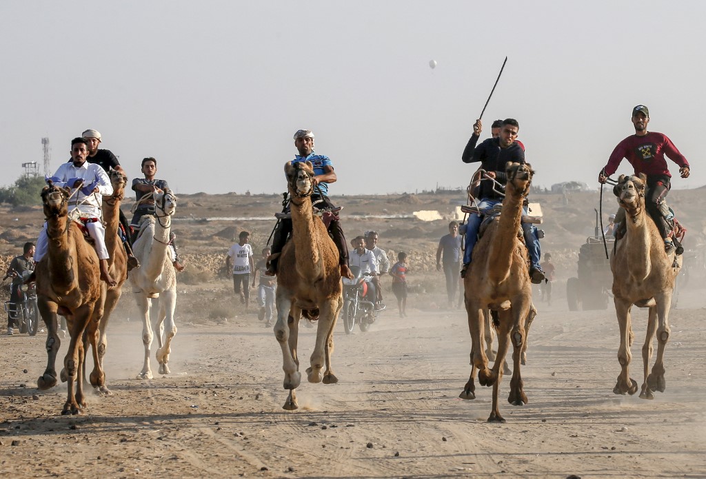 Palestinian jockeys compete during a local camel race held at the destroyed Gaza airport, in Rafah in the southern Gaza Strip on October 20, 2019. SAID KHATIB / AFP