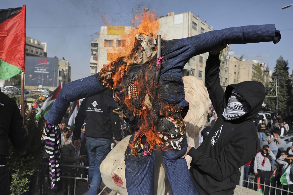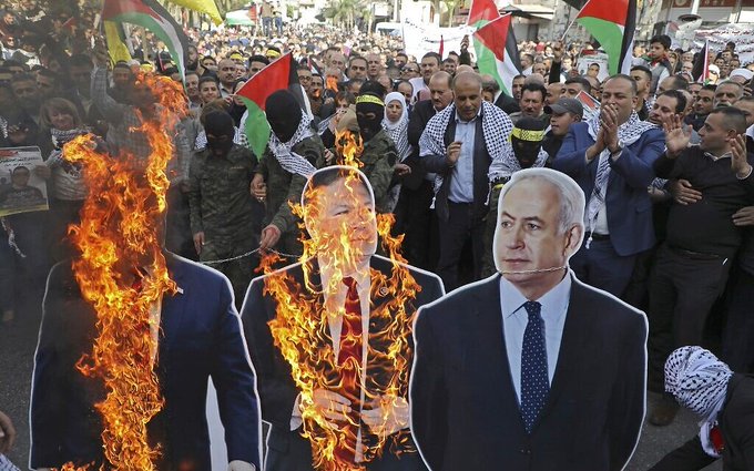 Around 2,000 people gathered in the West Bank city of Ramallah by midday, where they set ablaze posters of Donald Trump as well as Israeli and American flags. Schools, universities, and government offices were closed and rallies were being held in other West Bank cities.