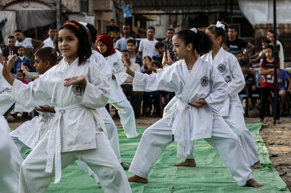 Young Palestinian karatekas demonstrate their skills during a Karate promotion ceremony at a sporting centre in the Rafah camp for Palestinian refugees in the southern Gaza Strip on September 20, 2019. SAID KHATIB / AFP