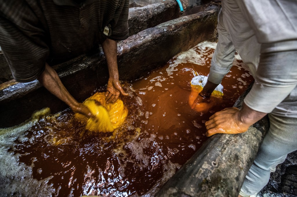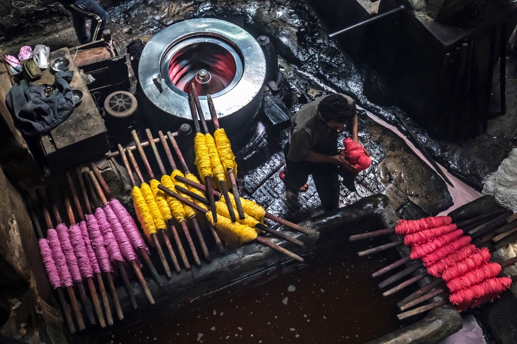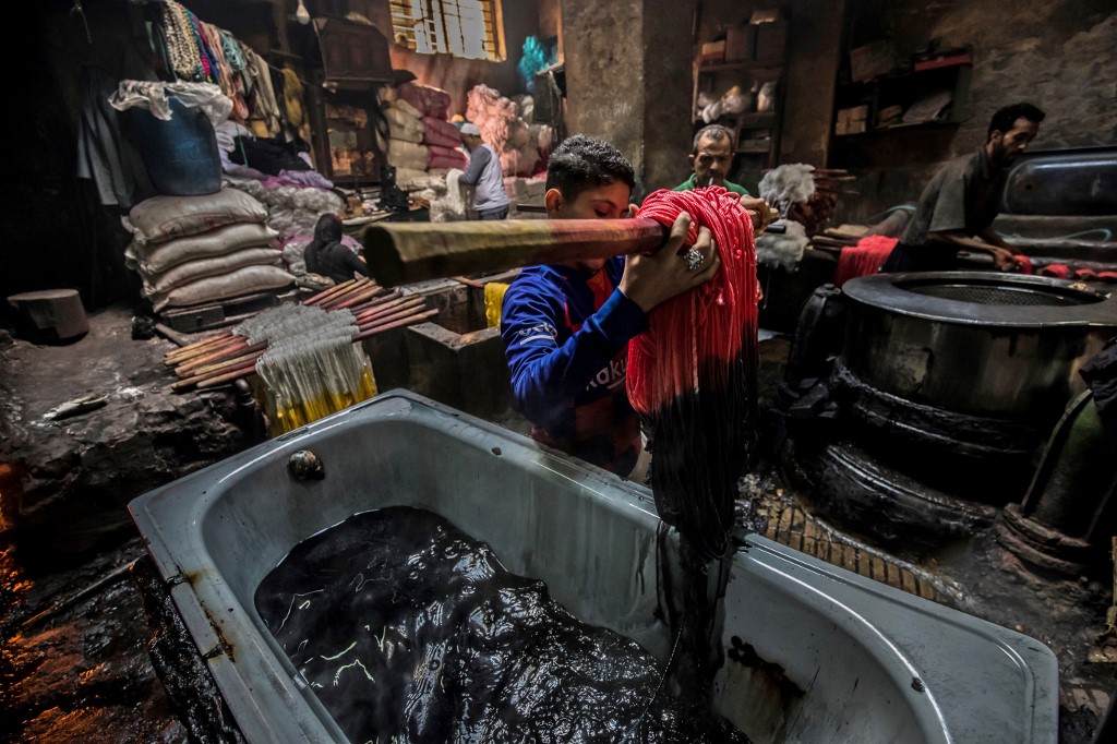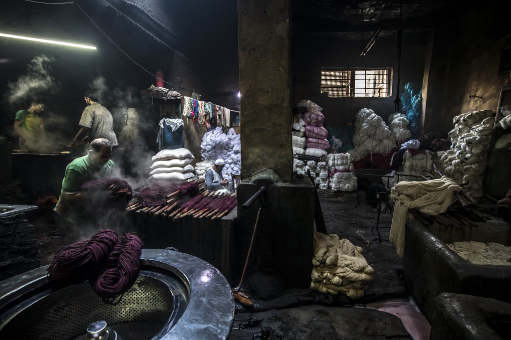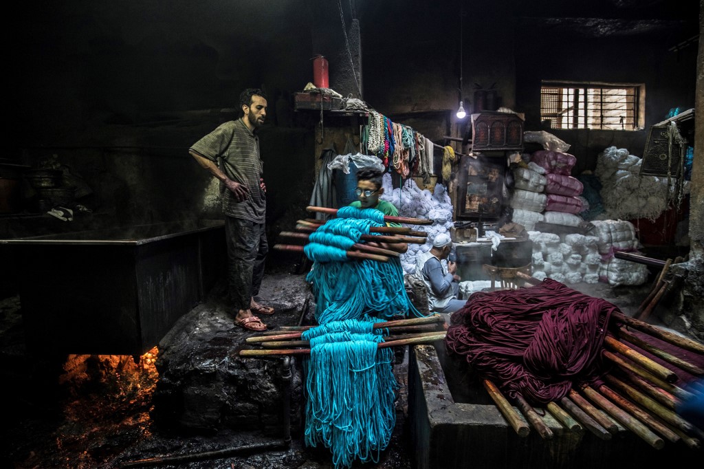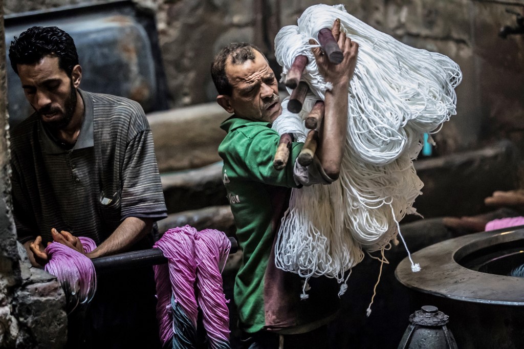 Salama and his relatives lay out the long, flowing threads, which will be used for everything from handmade shoes to rugs and drapes, and dip them in huge, piping-hot colour baths -- no gloves or masks protecting them from the dyes and chemical fumes. The workshop in Islamic Cairo has been going strong for over a hundred years. Khaled DESOUKI / AFP