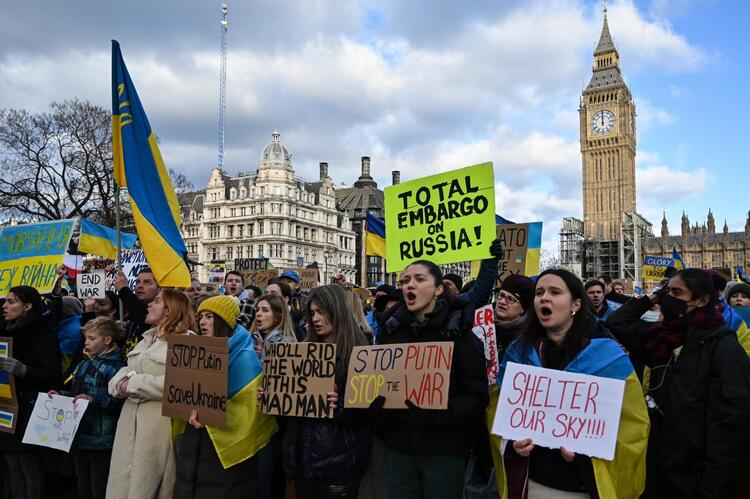 Demonstrators hold placards and Ukrainian flags during a protest rally for a Stop the War in Ukraine Global Day of Action, in central London, on March 6, 2022 as part of an international day of anti-war action, prompted by Russia's invasion of Ukraine. (Photo by JUSTIN TALLIS / AFP)